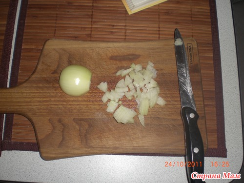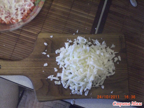 Теперь пора достать промариновавшийся лучок и выложить его следующим слоем, не забыть промазать майонезом!