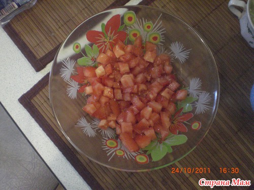Помидорки нарезать кубиками, выложить в салатницу, не забыв немного посолить.