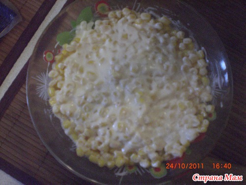Я кукурузу вообще не сильно люблю, но в этом салате она очень хорошо вписывается. У меня ушло 1/2 400- граммовой банки.