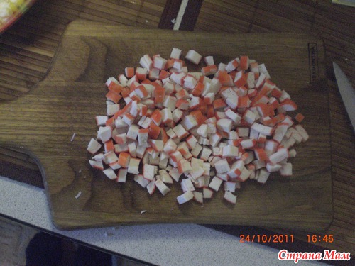 Крабовые палочки нарезать мелкими кубиками, выложить, посолить, промазать майонезом.