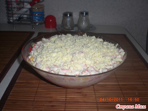 Сверху салат посыпать тертыми желтками. Дать пропитаться полчасика.