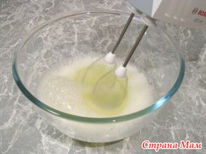 Взбивать до тех пор, пока масса не станет густой, плотной (я взбивала 10 минут, на средней скорости).