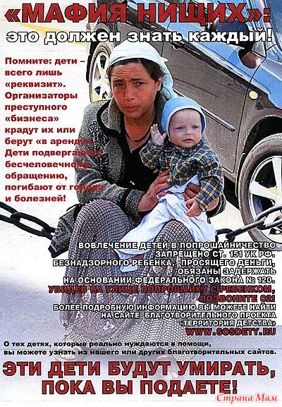 Когда вы видите в метро ли, на улице ли женщин с детьми, просящих милостыню, задумайтесь, прежде чем ваша рука полезет за деньгами. Подумайте о том, что не будь вашего и сотен тысяч подаяний, и бизнес этот умер бы. Умер бы бизнес, а не дети, накачанные водкой или наркотиками.