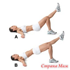 Выпрямите левую ногу (см. фото А). Опираясь на правую ногу и плечи, приподнимите бедра и корпус – так, чтобы тело образовало прямую диагональ (см. фото В). Оставайтесь в таком положении несколько секунд, затем вернитесь в начальное положение и повторите упражнение. Сделайте 2 комплекса по 15 раз. Если хочется увеличить нагрузку – во время выполнения упражнения скрестите руки на груди.