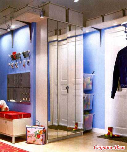 Если помещение прихожей невелико, если оно вытянутое и узкое, есть резон выкрасить его полностью в чисто голубой цвет. Это придаст пространству прихожей воздушность и необыкновенную чистоту.