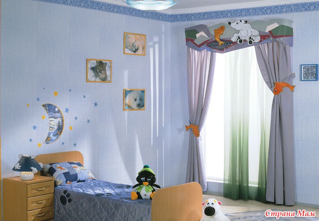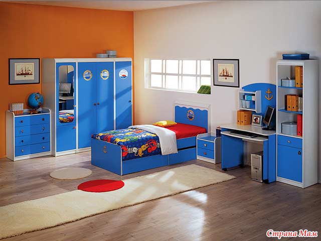 В сочетании с желтым и красным синий подходит для оформления детских комнат. Он содержит игровое начало, сочетаем также с розовым, светло-зеленым, охристым, оранжевым, сиреневым и другими цветами, которые сделают комнату малыша веселой
