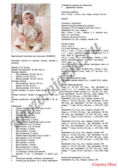 Вязаный спицами крестильный комплект для малышки Rosebud, состоящий из жакета, платья, капора, пинеток и рукавичек.