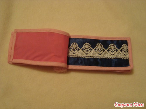 Второй разворот. Слева страничка из плащевки справа атлас и кружево. Внутри прощупываются кусочки пластиковая трубочка от сока.