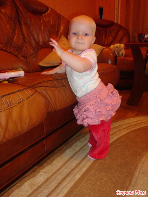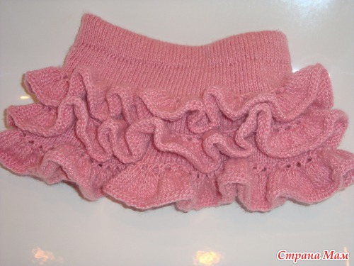 Набрала 120 петель, провязала лицевой гладью 15 см, 1 ряд изнаночный, 5 см лицевой глади (прибавив в первом ряду каждые 10 п по 1 петле для небольшого расширения юбочки), 1 ряд изнаночный, 5 см лицевой глади (прибавив каждые 10 п по 1 петле в первом ряду)), 1 ряд изнаночный.