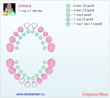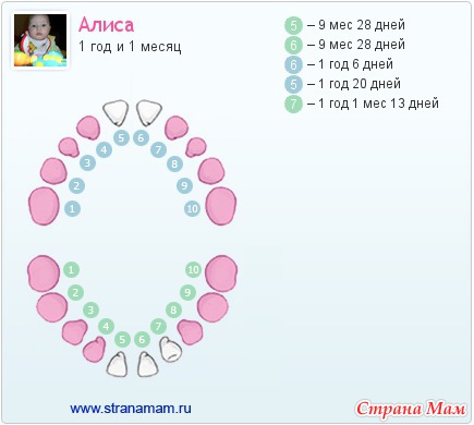 представьте что на картинке открытый ротик вашего малыша, с той стороны где прорезался там и отмечать