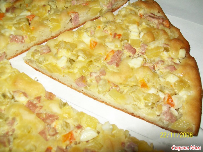 Взбить яйца, добавить кефир, соду, соль, взбить. Всыпать муку, взбить до однородной массы, без комочков. Смазать форму для пиццы раст. маслом. Тесто разделить на две порции, одну влить в форму, разровнять и аккуратно разложить начинку, обсыпать тертым сыром, поставить в разогретую духовку на 20 - 30 мин. при t 200 С. И.. вуаля.. пирог готов!