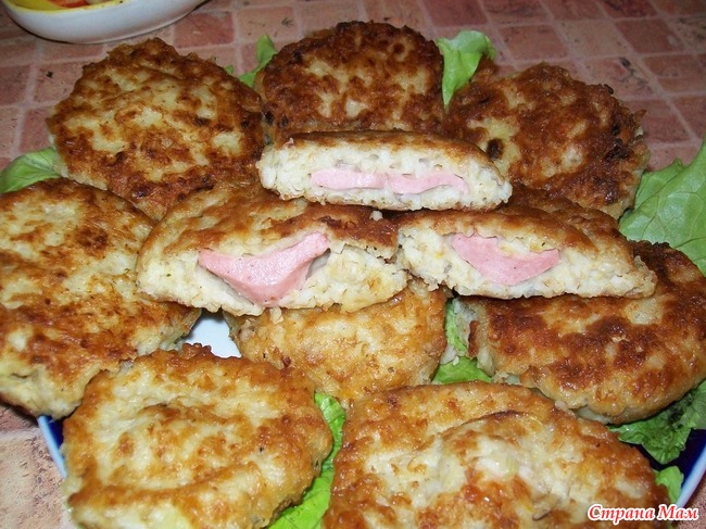 Сварить крутую кашу на воде. Остудить. Добавить яйца, мелко нарезанный лук, соль, специи, муку. Масса должна получиться вязкая. Затем эту массу столовой ложкой выкладывать на разогретую сковороду, аккуратно формируя котлетки. В центр поместить кусочек сардельки и слегка придавить, а сверху прикрыть ещё порцией геркулесовой массы. Поджарить с двух сторон на среднем огне до золотистой корочки.