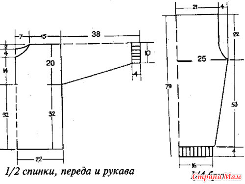 ПЕРЕД. Начните вязать так же, как спинку. Провязав от начала работы 8 рядов, провяжите вместе 30-ю и 31-ю петли и сделайте накид - это отверстие для шнура. Такое же отверстие. сделайте через 18 п. Провязав б рядов бирюзовой пряжей (80 рядов от начала работы), закройте 2 средние петли и далее вяжите раздельно правую и левую части. Провязав 40 рядов, закройте с каждой стороны для горловины по 6 п., 3 п., 2 п., 1 п. в каждом 2-м ряду. Провяжите еще 8 рядов и закройте по 27 п. плеча. Сшейте плечевые швы.