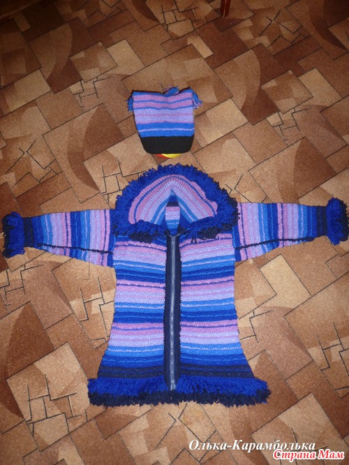 Как и всегда - не могу следовать строго описанию, связала немного по-своему - капюшон не стала вязать, и так тяжеловато пальтишко получилось, да ведь и шапка не маленькая, короче связала воротник (спицами, обвязав крючком так же "длинными петлями" )... Добавила в пальто карманы, и не маленькие (в описании о них ни слова не было