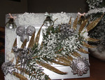 Снег - тёртый на терке пенопласт... правда его лучше все-таки на улице тереть или на балконе.......шарики слева наверху сделаны из ниток... я точно не знаю как эта техника называется называется... перешь иголку с ниткой прокалываешь клей ПВА затем вытаскиваешь иголку и наматываешь на маленький воздушный шарик... когда клей подсохнет. прокалываешь шарик и вытаскиваешь.. у нас остается такой ажурный шарик.... Все клеила на момент- монтаж (еще после ремонта остался) пробовала на супер клей, ничего не клеит((((( уже отчаились.... пока не вспомнили про момент - монтаж. Лист папоротника золотой еще в прошлом году покупали рублей за 20, в магазину елочных украшений..... в центере веточка еловая.... Взяли кисточку, обмазали клеем всю веточку и обмакнули в тот самый пенопласт тертый.... эффект закрепили лаком для волос с блестками (маленькая прицесса - детский лак).....шишки и сухостой , который нашли на улице..... покрасили серебристой краской. В окончательном варианте слева еще приклеили сережки от березы , тоже покрашенные в серебрянный цвет...Вообщем работу дорабатывали еще несколько раз...Использовали также немного шарикового пластилина.