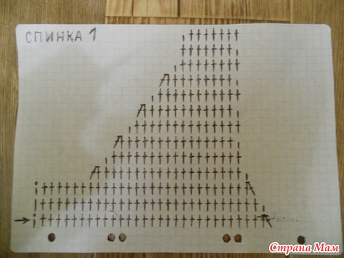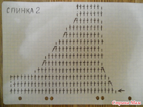 Вязание скосов для пройм смотрим по предыдущим схемам, они одинаковые для переда и спинки. Три последних ряда без убавлений