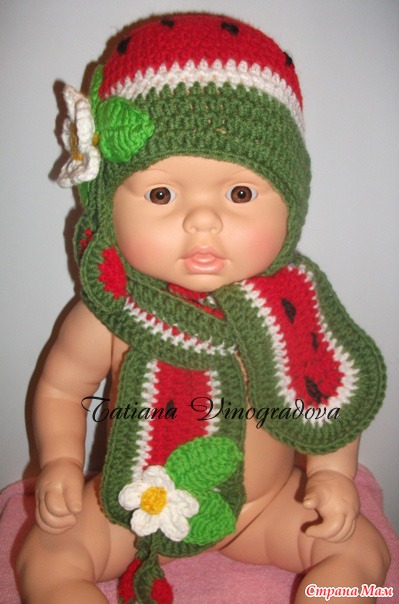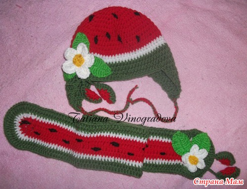 А шарфик....набрала нужное кол-во петель и вязала по кругу, прибавляя в начале и конце (за основу брала схемку к подошве для пинетки), вязала также полустолбиками с накидами.