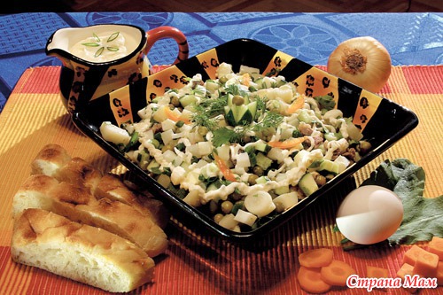 На 50 г отварной говядины: отварной картофель – 50 г, зеленый горошек – 30 г, маринованные огурцы – 30 г, яйцо – ¼ шт., зелень и соль по вкусу.