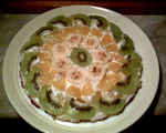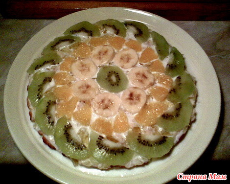 Тесто: 50 г маргарина, ст. ложка сметаны, две ст. ложки сахара, соль, сода, мука. Испечь один тонкий корж. Он будет основой торта. 100 г сметаны взбить с полстакана сахара и ванилином. Добавить к сметане нарезанные фрукты и кусочки желе (сделать желе заранее, застывшее нарезать кубиками). Выложить все на корж. Верх торта украсить фруктами (банан, киви, апельсин). Поставить в холодильник на несколько часов.
