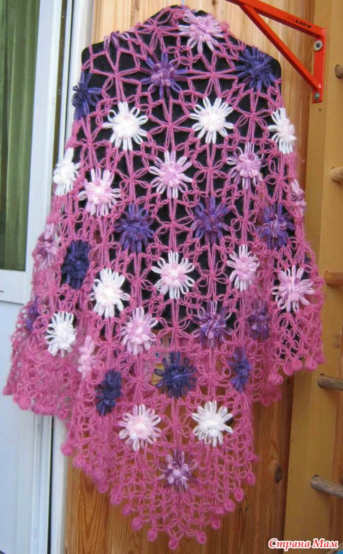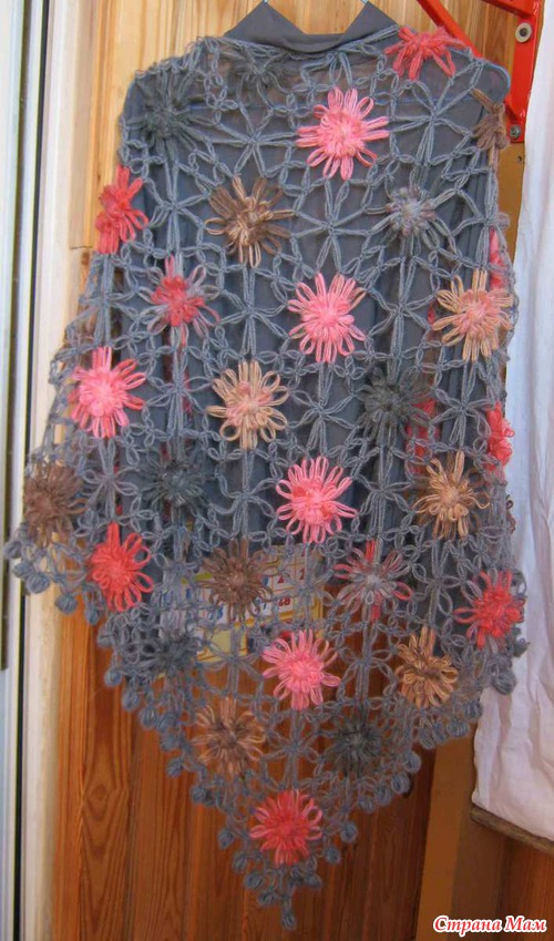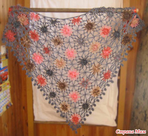 В серой шали треугольнички я заполнила тож маленькими цветочками на луме, в лиловой объвязала соломоновыми петлями и сразуже, не отрывая нить сделала объвязку из 4х рядов сломоновыми петлями низа шали, последний ряд с бомбошками.