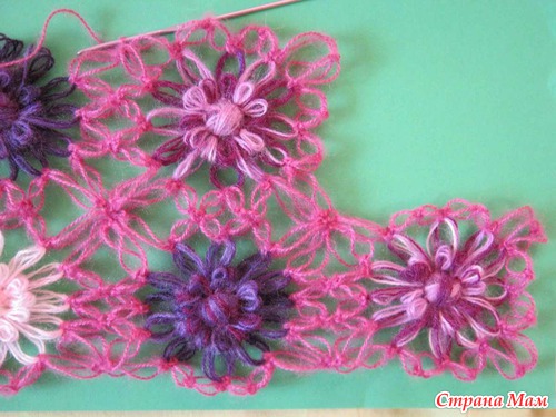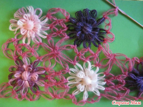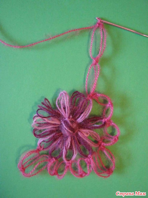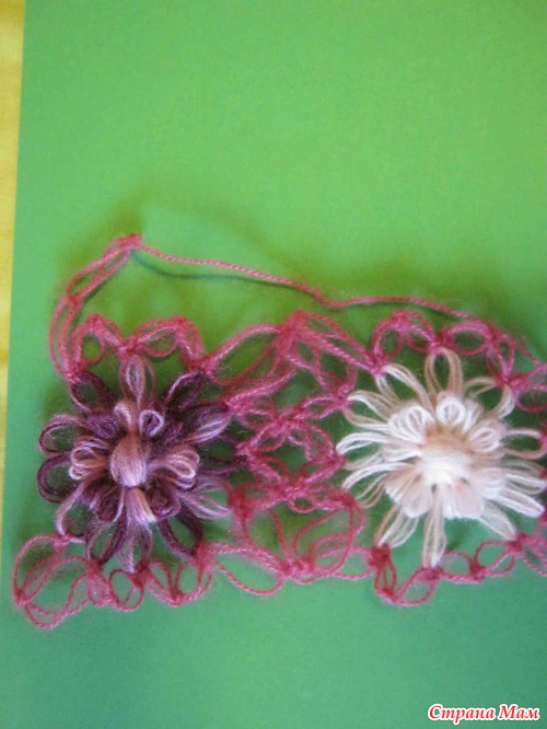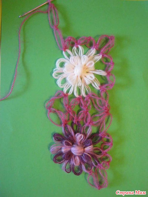, в нем вяжем уже на один цветок меньше, т е если в первом ряду было 9 цветом, то во втором будет 8.
