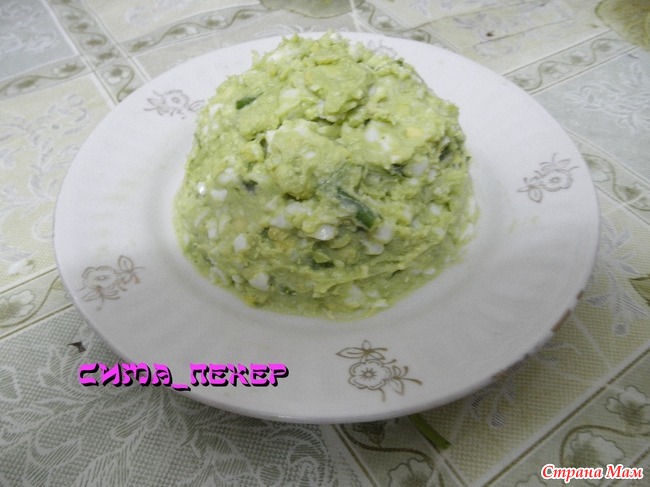 Варим вкрутую яйца, измельчаем. Я это делаю картофелемялкой. Режем мелко зеленый лук. Все смешиваем. Добавляем по вкусу соль, перец, сок лимона.