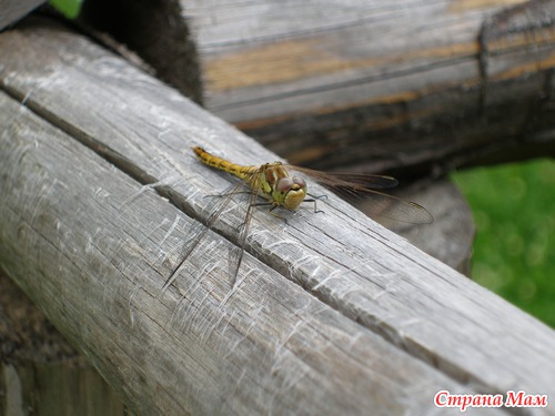 а дело было на даче. мы только что приобрели фотоаппарат и фотографировали все подряд: все движимые и недвижимые предметы. и тут в поле зрения нам попалась стрекоза, которая сидела на старом каркасе теплицы и грелась на солнышке. пока мы ее фотографировали возникло ощущение, что она нам позирует, а когда увеличили снимки, оказалось, что она еще и улыбается. посмотрите сами.