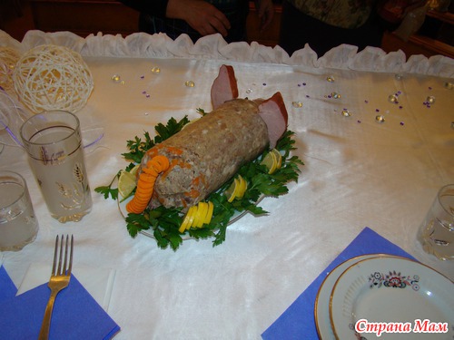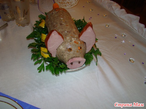 зубочистками прикрепила "пятак", хвост из морковки и уши из ветчины...