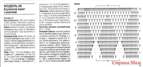 Сборка: выполнить боковые швы и нижние швы рукавов. Вырез горловины обвязать рюшем. По нижнему краю рукавов выполнить по 1 ряду столбиков без накида и рюша. Вертикальные края полочек и низ жакета обвязать 1-м рядом столбиков без накида. Атласную ленту продеть сквозь отверстия в первом ряду каймы. Связать две «шишечки» и пришить их к полочкам.