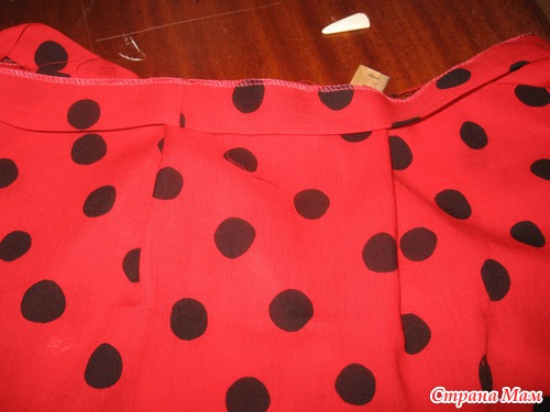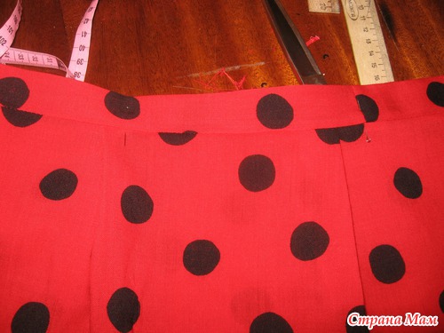 затем скалываем пояс *необметанным срезом* с верхом полотнища юбки в четырех получившихся точках..