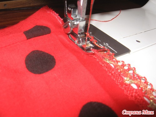 и притачиваем к обметанному краю юбки кружево.. можете его присобрать.. заложить складочками.. если количество кружева позволяет..
