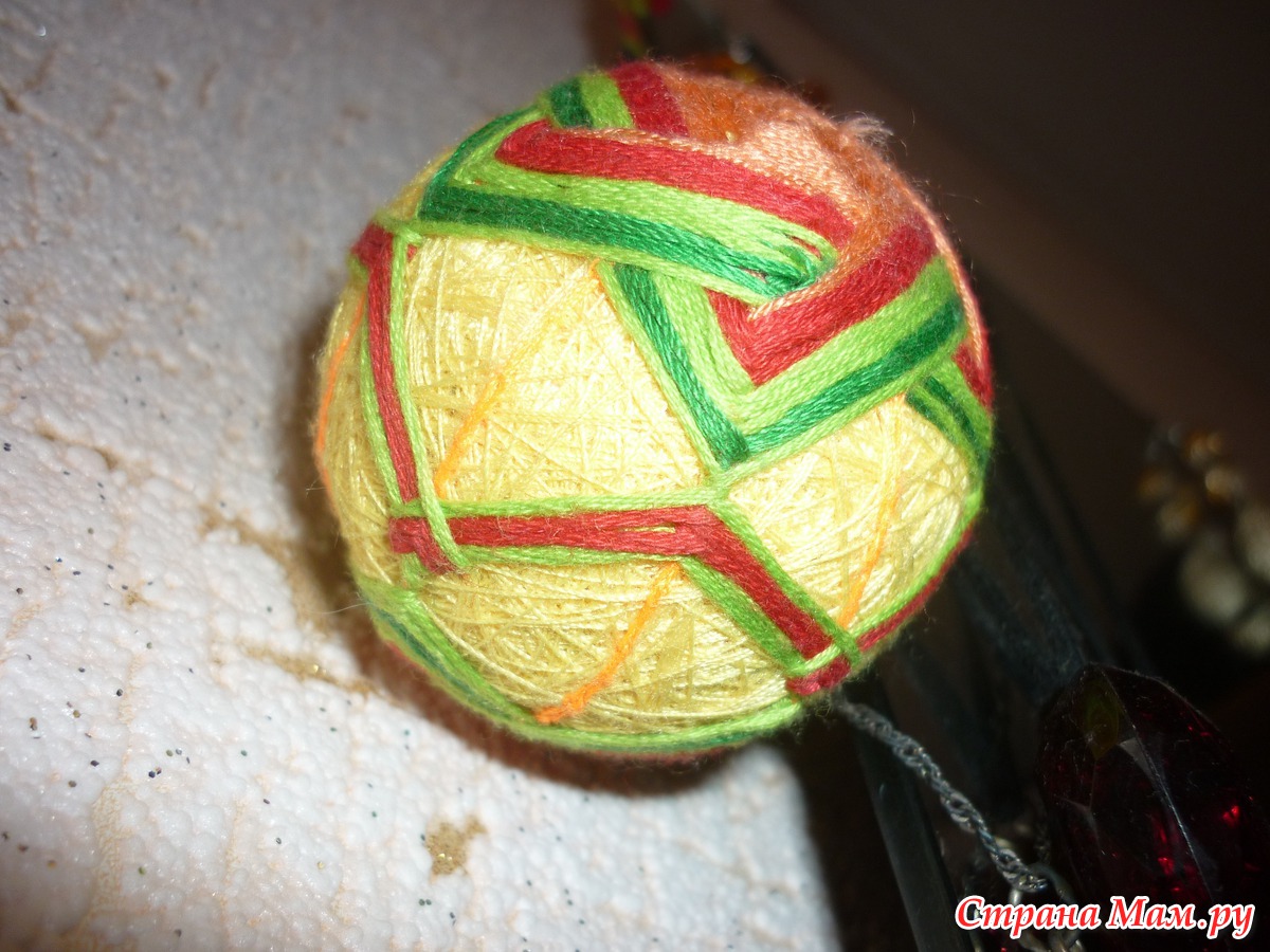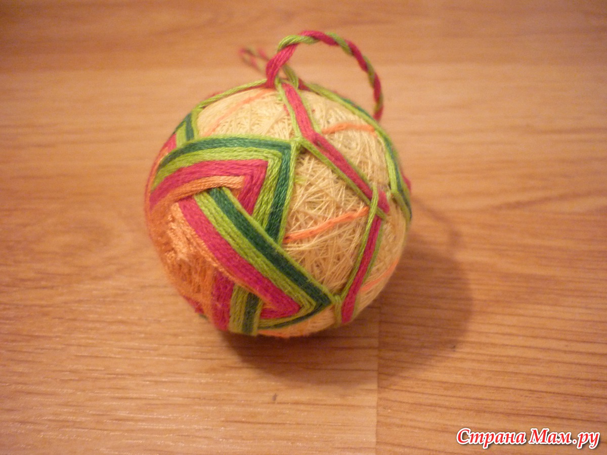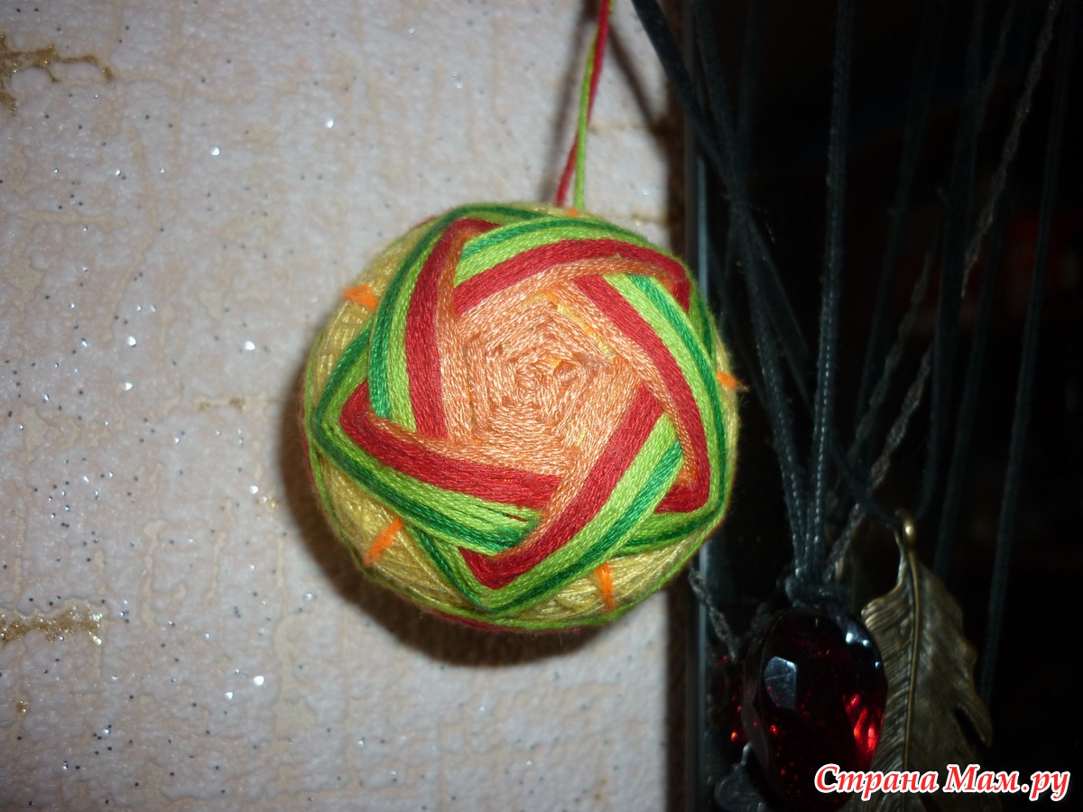 Но вернемся к основе. Самые увлеченные рукодельники, конечно, и слышать ничего не хотят, чтобы за основу взять пенопластовый шарик или, скажем, теннисный мяч. Только подавай им рисовую шелуху, чтобы всё было аутентично. Да еще и бубенчики туда вкладывают. Однако, чтобы напрочь не запугать начинающих, мы рекомендуем взять что-то круглое, например, теннисный мячик, обмотать сначала толстыми шерстяными нитками до обхвата примерно 24 см, а потом, поверх шерстяных – обычными швейными, полностью закрыв предыдущий слой. Придать идеально-круглую форму пакету с рисовой шелухой или скомканной бумаге несложно, обмотав полосками ткани и нитками, но у начинающего может сразу не получиться.