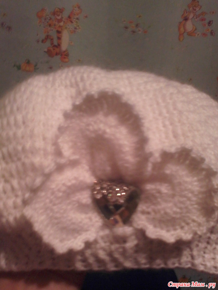 затем без прибавок (не помню сколько рядов, но получается широкая шапка по ушки), затем два ряда равномерных убавок, нить оторвать
