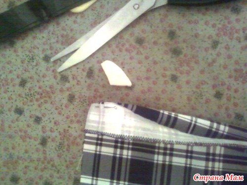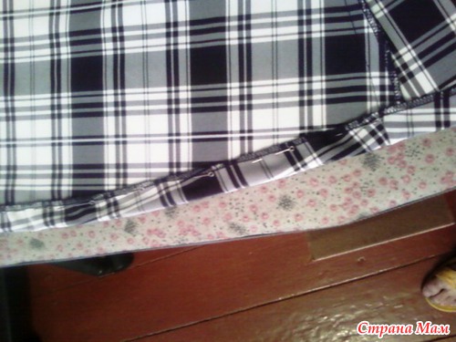 Я прострачиваю по линии клетки, можно по линии сгиба которая получится при утюжке низа, если вы утюжили до конца, но на некоторых тканях проще линию низа прочертить. Ничего не выстригаете, уголок и так ляжет замечательно, стоит вам только взять уголок вот так