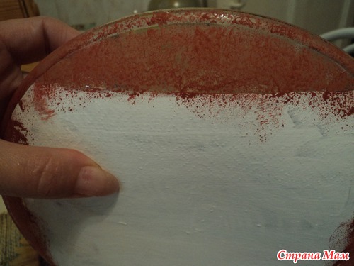 Подобрала краску по цвету салфетки(смешать краски красную и коричневую) и нанесла губкой не густо, чтобы оставались просветы.