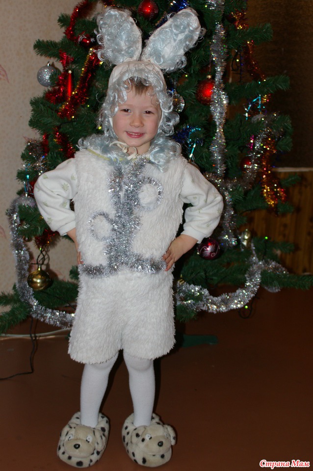 Жилетка и шортики сшиты из подкладки на куртку. В нем старший был белым медведем, потом зайцем. Ушки достались по наследству от подруги.