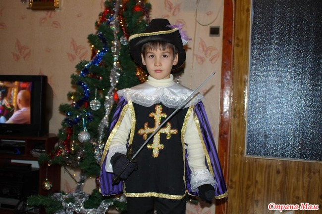 Вот такой мушкетер получился у меня в прошлом году. Купила готовую накидку и расшила ее, добавила кружева на воротник, такие же же кружева пришила на рукава. Шляпу делали из ковбойской: обшила края, один край зашит сверху брошь и перо. А зайчик вообще универсальный костюм