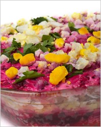 Для повседневного варианта этого салата нужно разделать целую селедку, если она довольно соленая – вымочите ее до состояния немного соленого. А если она малосольная – тогда не нужно вымачивать. Отвариваем в подсоленной воде картофель в мундире, потом чистим его от кожуры и натираем на терке. В первом варианте она отсутствует, так как она может придать лишнюю грубость салату, а в повседневном варианте – дает сытость. Поверх картофеля выкладываем слой майонеза. Дальше – слой мелконарезанной селедки, посыпанной сверху рубленым лучком (кстати, лук тем вкуснее, чем мельче он порезан). Сверху опять смазать майонезом. Дальше слой мелконарезанных сваренных вкрутую яиц, опять слой майонеза. Последний слой – предварительно отваренной и потертой на крупную терку свеклы по всей площади салата (не только сверху, но и с боков), сверху также политой майонезом. Если вы готовите для своих, не для гостей, то практичнее будет готовить это блюдо не на широком блюде, а скорее в миске, в более закрытом сосуде, чтобы при хранении в холодильнике оно не впитало в себя посторонние запахи.