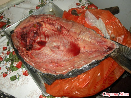 В начале надо разрубить сазана по хребту, вытащить внутренности, промокнуть ненужной тряпочкой (салфеткой) кровь и посолить.
