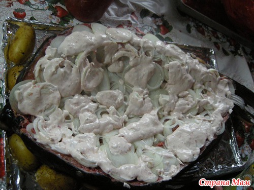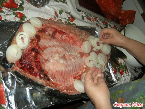 Затем нарезаем кольцами лук и выкладываем его на рыбу.