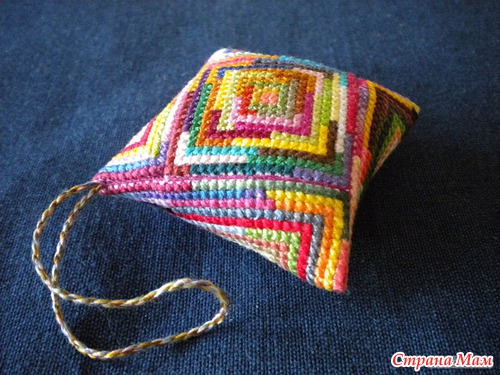 По спирали остатками ниток разных цветов вышиваем два квадрата, один 40 на 40, второй 20 на 20. Бэкстич по периметру квадратов для сшивания.