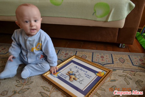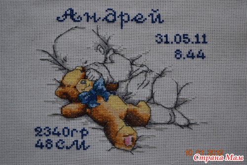 Очень давно не вышивала и как только появилась возможность, да ещё и просматривая свои схемки-загорелась этой картинкой... Благодаря мужу(он 3 вечера гулял с Андрюней, пока мама наслаждалась забытыми ощущениями от любимого хобби) вышилась вот такая метрика)))Ошибочки есть, да и цвета не по ключу подбирала сама и немного не попала... но в целом сойдёт(я ожидала лучшего)