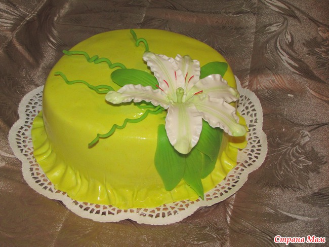 При обтяжке торта с лилией, мне не совсем удалось разровнять бока, как-то они у меня настойчиво собирались рюшиками и никак по другому, к тому же масляный крем стремительно таял. Вообщем решила оставить эти самые рюши.