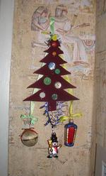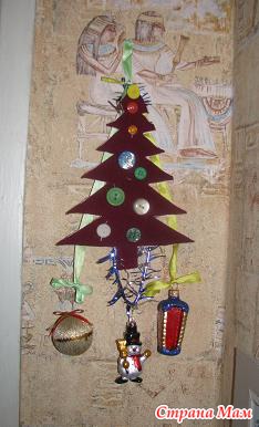 Эту ёлочку сделали мы с дочкой в прошлом году.Я вырезала из драпа форму ёлочки. Потом дочка пришивала на неё пуговочки. Чтобы изделие удерживало форму, наклеили его на картон, добавили ленточки, лёгкие игрушки.