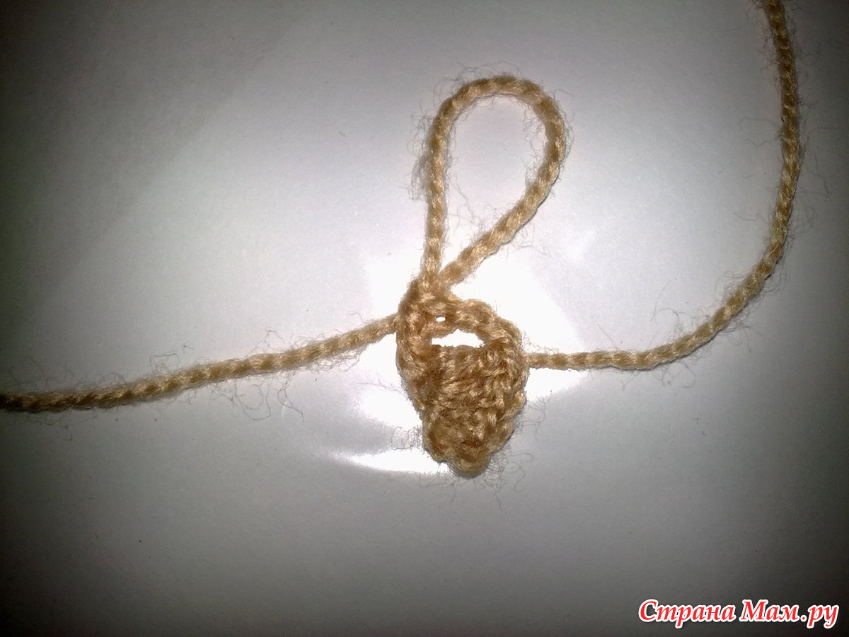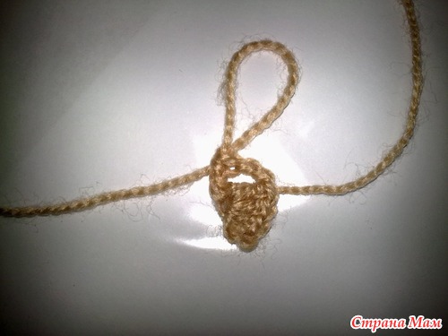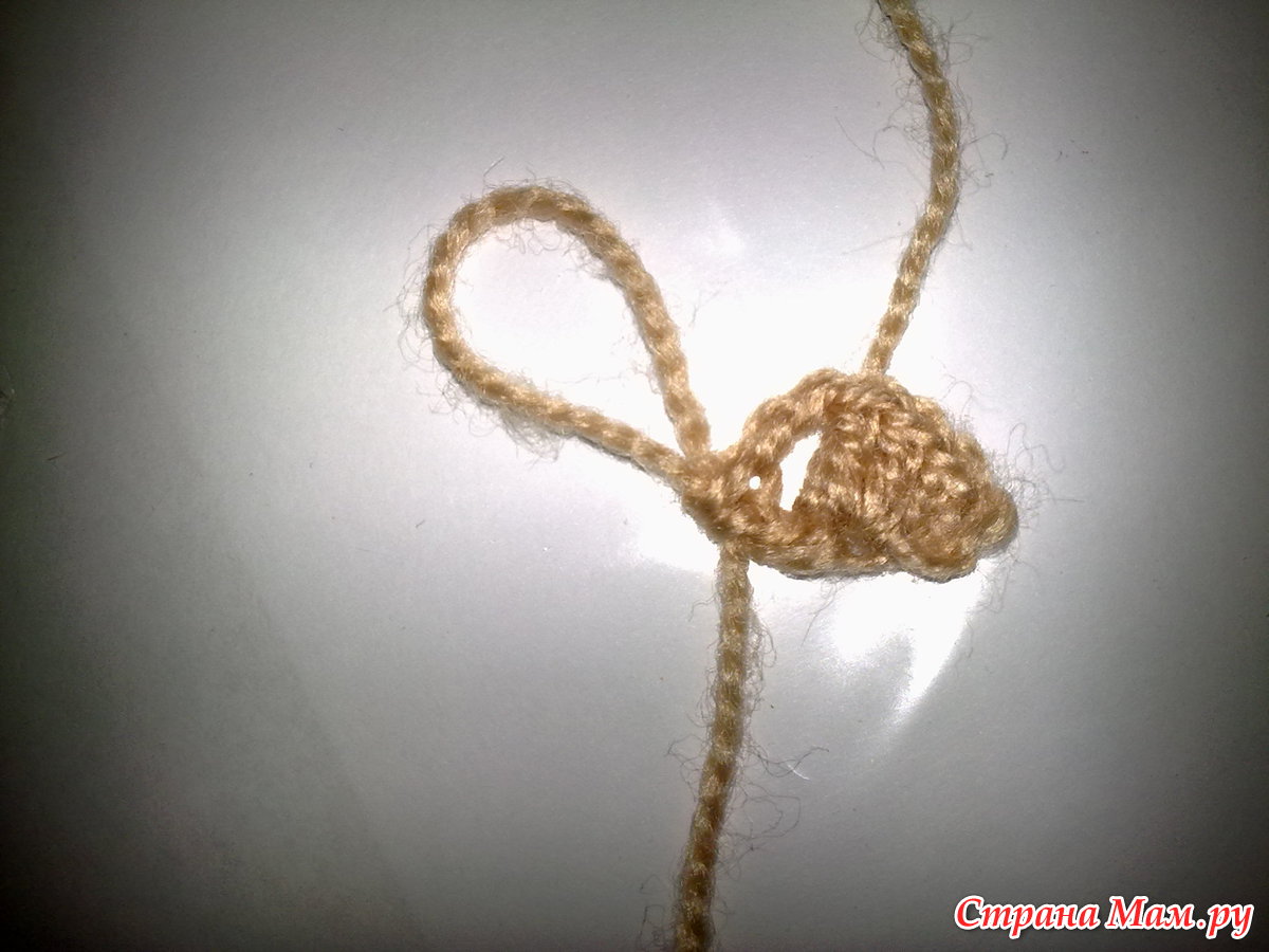 Связать цепочку из 3вп, в 3ю петлю от крючка связать 3 ссн, 2вп спускаем вниз, провязываем сс в ту же 3ю петлю.
