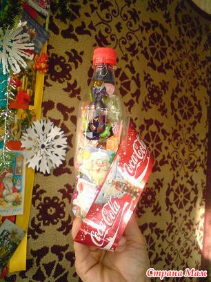 Можно использовать тару разного объёма, наполняете по своему желанию - конфеты, мишура, орешки.. Эффектно смотрятся "игрушки за стеклом" ( мы одной девочке куколку клали ).