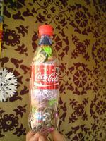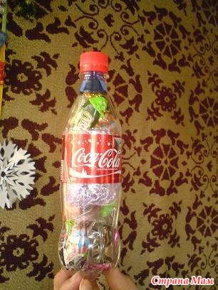 Можно использовать тару разного объёма, наполняете по своему желанию - конфеты, мишура, орешки.. Эффектно смотрятся "игрушки за стеклом" ( мы одной девочке куколку клали ).Процесс требует аккуратности.