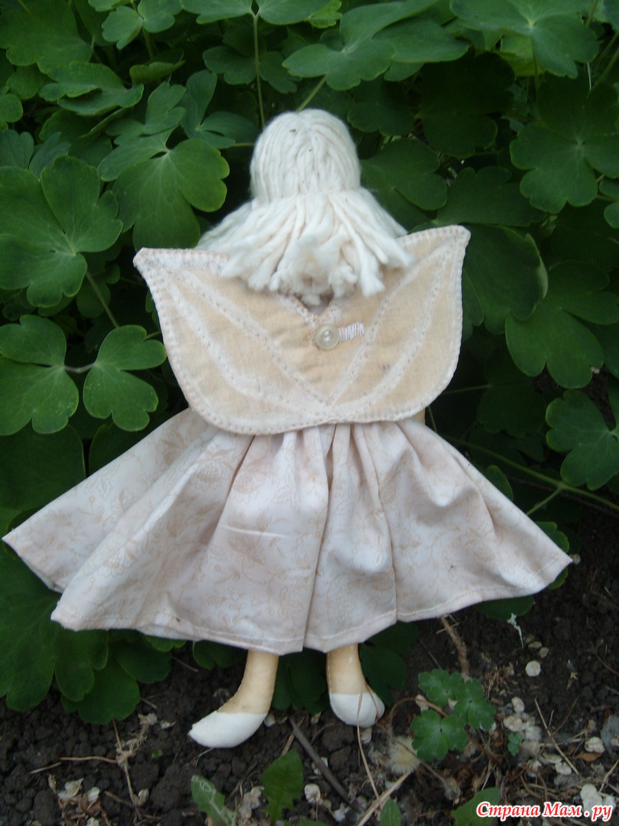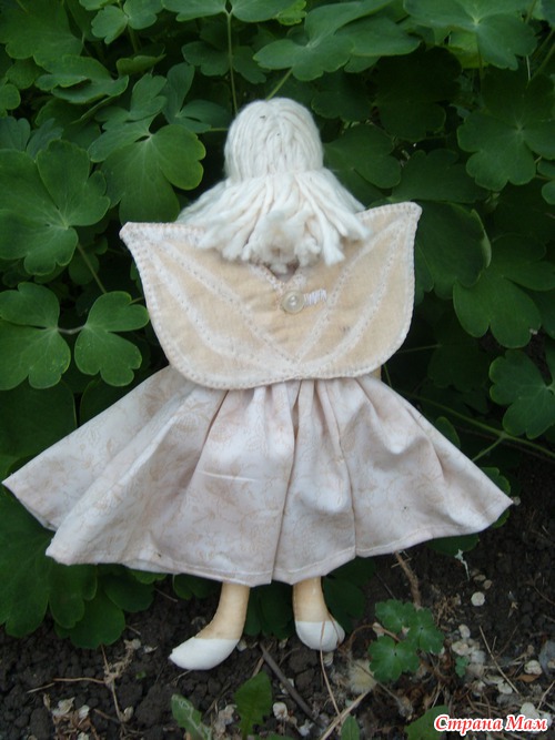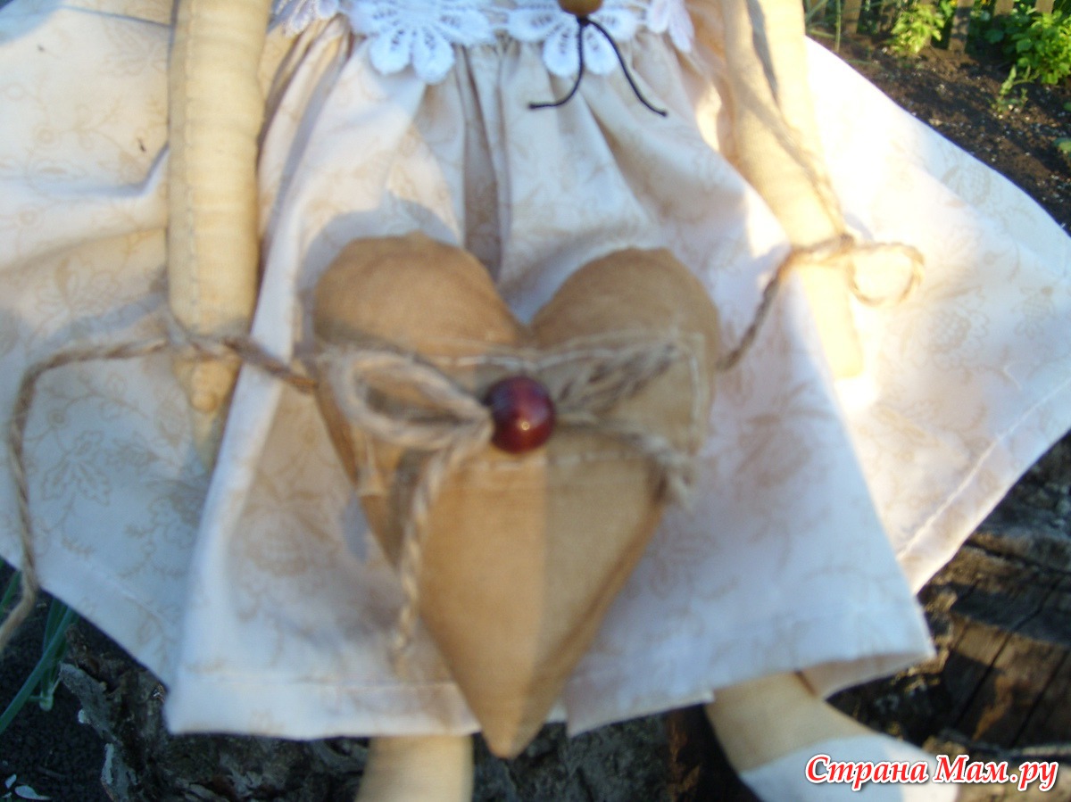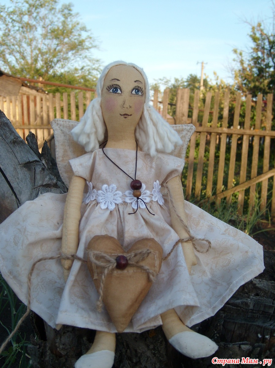 Вчера пошила ангела доброго сердца. Выкройку рисовала сама. Одёжка - американский хлопок, волосы - из нитей швабры. Сшита из бязи, тонированной чаем. Лицо расписывала акрилом. Наполнитель - синтипух. Моим домашним понравилось...