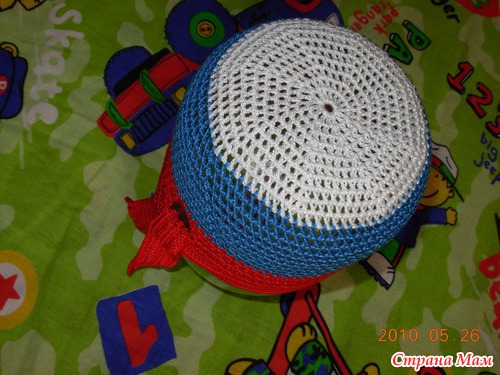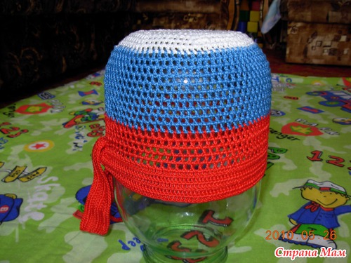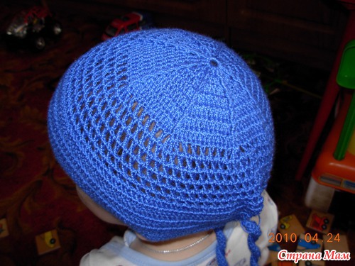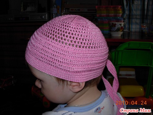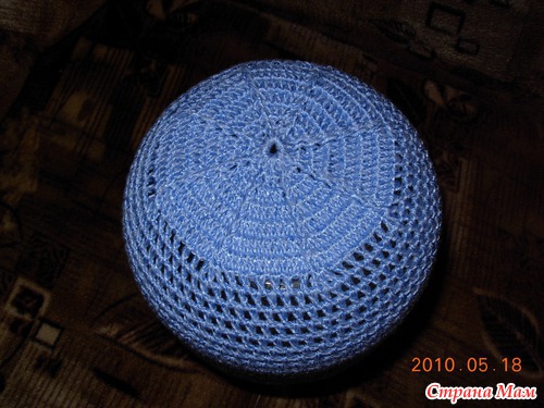 Вяжем дно-набрать 8 в.п. и замкнуть в кольцо; 1р- 12 ст с/н, 2р-24 ст с/н, а далее все прибавления распределить на 12 «клиньев» до диаметра 7-8 см. Далее вяжем тулью- 6 круговых рядов и 7 прямых-обратных в каждом ряду вначале и в конце делая убавки путем провязывания 2х ст вместе. В последнем ряду вяжем цепочку желаемой длины, для завязок (50 вп.). Теперь вяжем околышек вместе с завязками ст б/н , у меня 5ст…