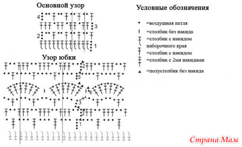 Узор юбки: Количество петель делиться на 8. Работать по кругу. Провязать одкн раз с 1 по 5-й кр. ряд, затем постоянно повторять 2-5 кр. ряды узора. Плотность вязания